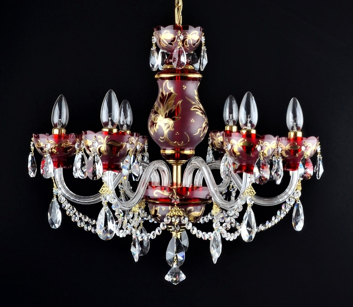 Rubínově červené sklo. Luxusní křišťálový lustr zdobí 24K zlatá ruční malba.