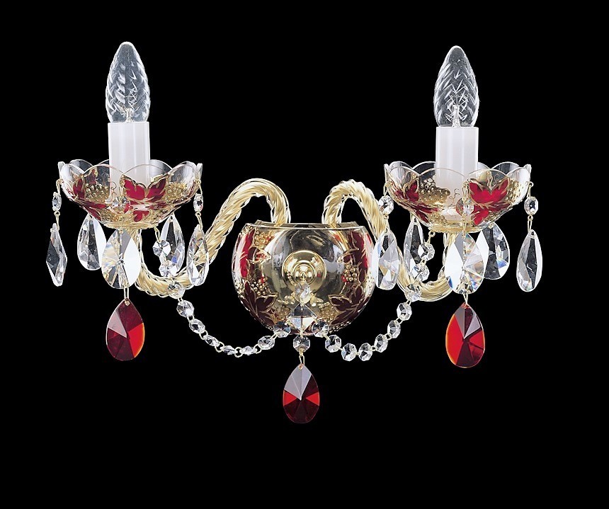 Vzorky - 8, 6-ti ramenný lustr s rubínovými ověsy, nástěnné světlo. Kov - lesklá zlatá mosaz.