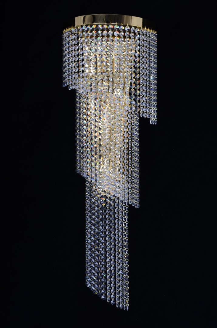 Klasické křišťálové spirálové lustry pro osvětlení točitého schodiště běžných menších domů. Tyto designové lustry jsou většinou vyrobeny z malých štrasových kamínků a dlouhých křišťálových hranolů ve tvaru nejrůznějších spirál. Jejich úzký podlouhlý tvar by měl zajistit dostatek světla po celé délce schodů. Pro zajištění dostatku světla jsou tyto dlouhé třpytivé spirálové lustry často doplněny lesklou stropní deskou doplněnou bodovými světly. Lustry jsou většinou dodávány jako přisazené, ale lze je zavěsit i jako "klasické" lustry, tj. na závěsnou tyč, nebo řetěz - viz. přiložené fotografie. Dlouhé štrasové křišťálové řetízky jsou poměrně drahé. Použitím tohoto typu závěsu můžete ušetřit na ceně lustru.