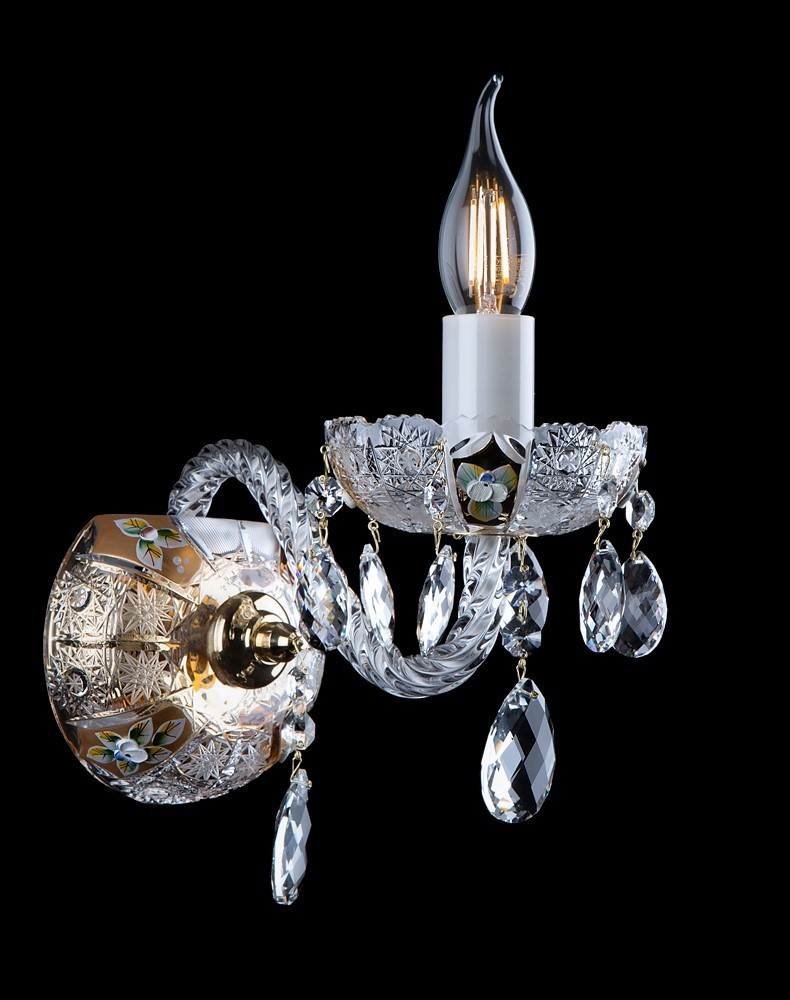 Luxusní křišťálové světlo na zeď zdobené krajkovým brusem PK500 a květy z vysokého smaltu na zlatém 24K pozadí.