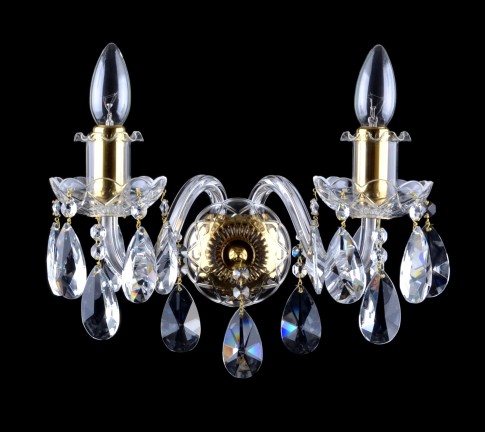 Dvouramenné křišťálové světlo na zeď do pokoje s broušenými křišťálovými vachtlemi a profilovanými skleněnými rameny. Elektrické objímky jsou zakryty zlatými mosaznými šešulemi a dozdobeny skleněnými převleky (lipnami).
