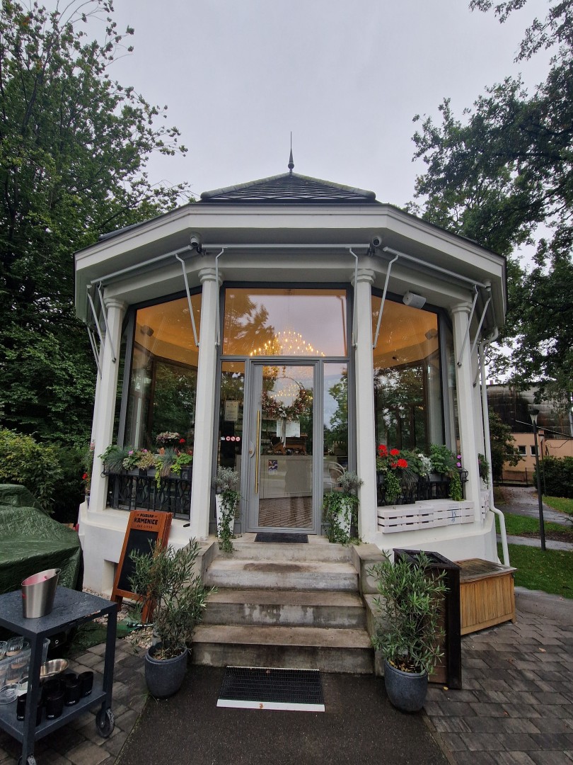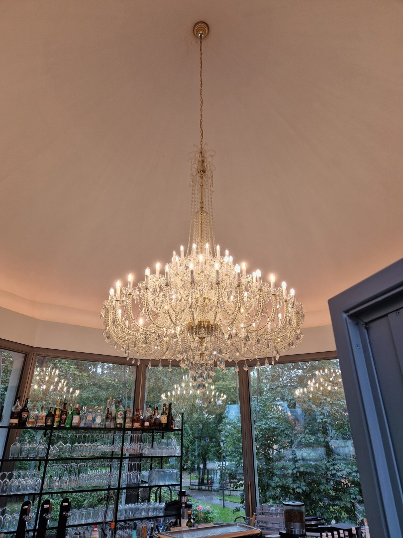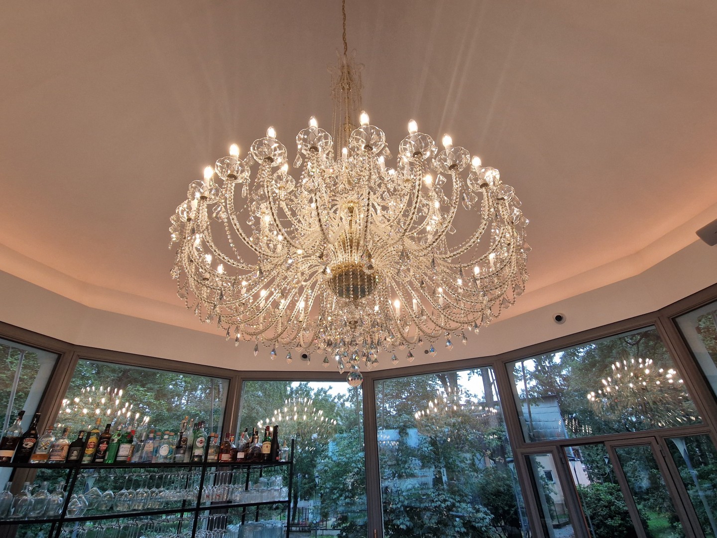 Servis lustrů u zákazníka - velký křišťálový lustr se 60 žárovkami v altánu kavárny Háječek.