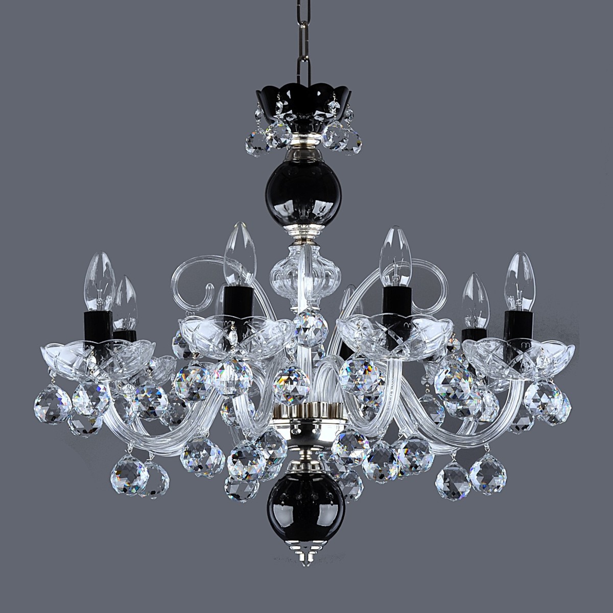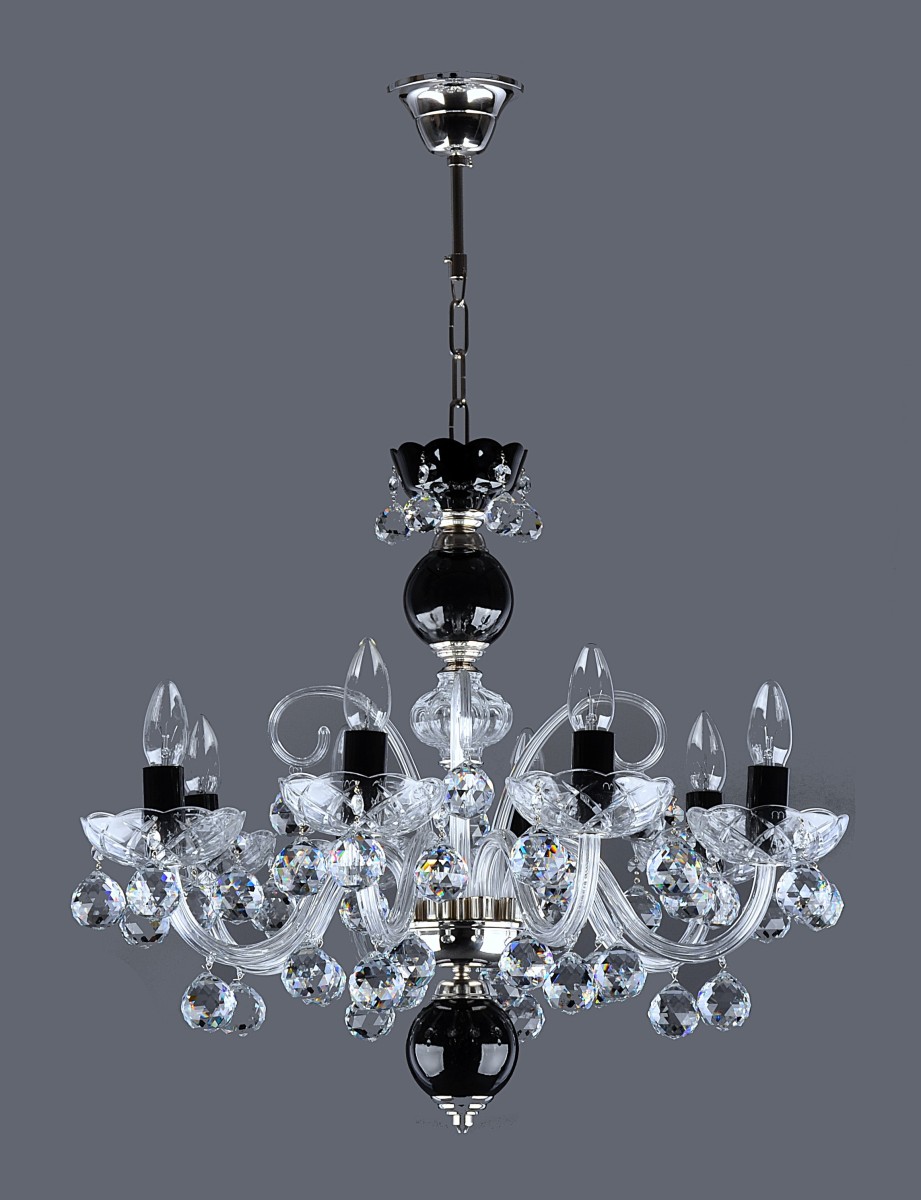 Nadčasový křišťálový lustr v kombinaci černého a čirého křišťálového skla. Kontrastní design lustru vnáší do prostoru řád a harmonii protikladů černé a bílé, podobně jako Jin a Jang. Lustr má 8 pevných profilovaných skleněných ramen ozdobených kolulemi z broušeného olovnatého křišťálového skla. Kontrastní efekt ještě více podtrhuje lesklý stříbrný kov, díky němuž svítidlo působí sofistikovaně a čistě.