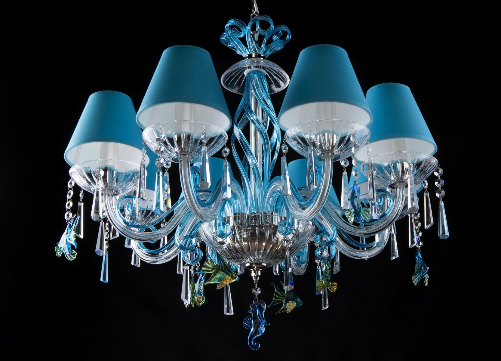 Designový modrý křišťálový lustr zdobený broušenými křišťálovými kopyty a barevnými rybami z ručně foukaného skla. Místo křišťálové koule uprostřed lustru je krásný mořský koník. Všechny barevné komponenty jsou vyrobeny ze skla, bez použití plastu.