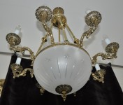 Velký košový lustr z kvalitních mosazných odlévaných dílů a ručně broušené pískovaného skla.