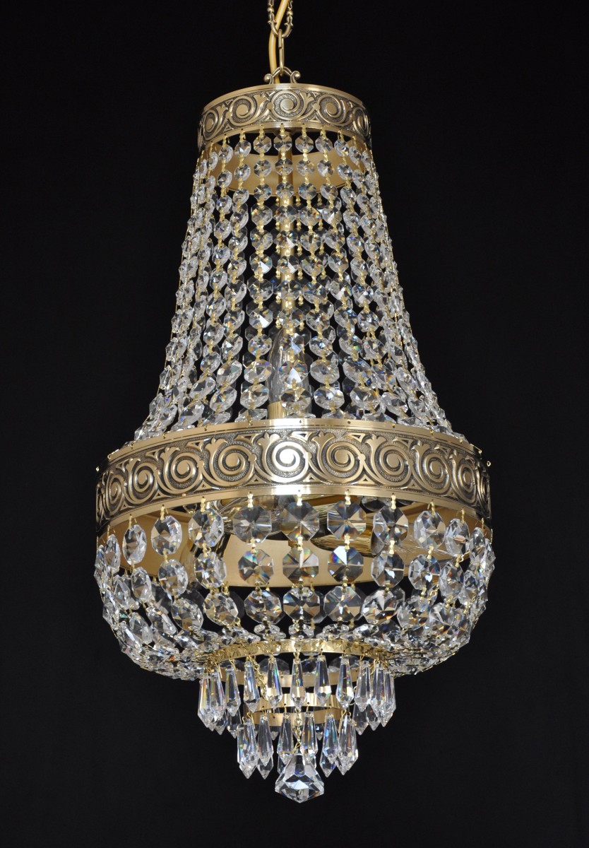 Stylový košový křišťálový lustr z odlévané mosazi se zvýrazněným ornamentem