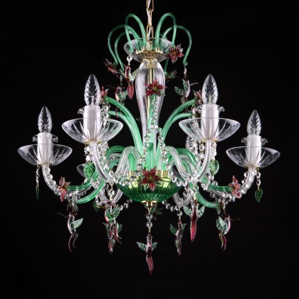 Zelený křišťálový lustr se skleněnými ptáčky a květinami