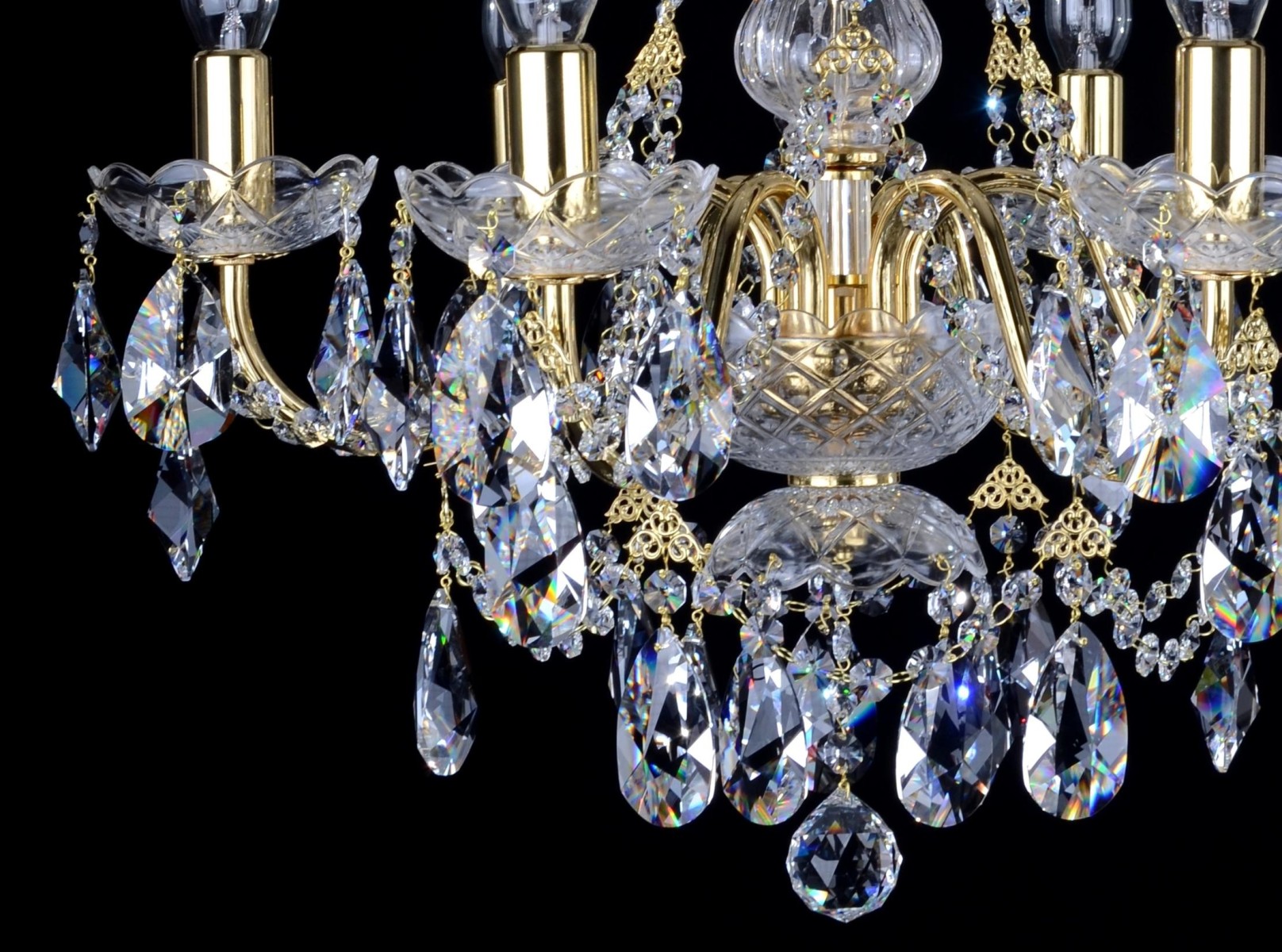 Zlatý mosazný křišťálový lustr se 6-ti trubkovými kovovými rameny.
